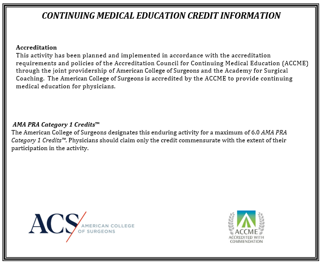 Successful completion of this CME activity, which includes participation in the evaluation component, enables the learner to earn credit toward the CME requirements of the American Board of Surgery’s Continuous Certification program.